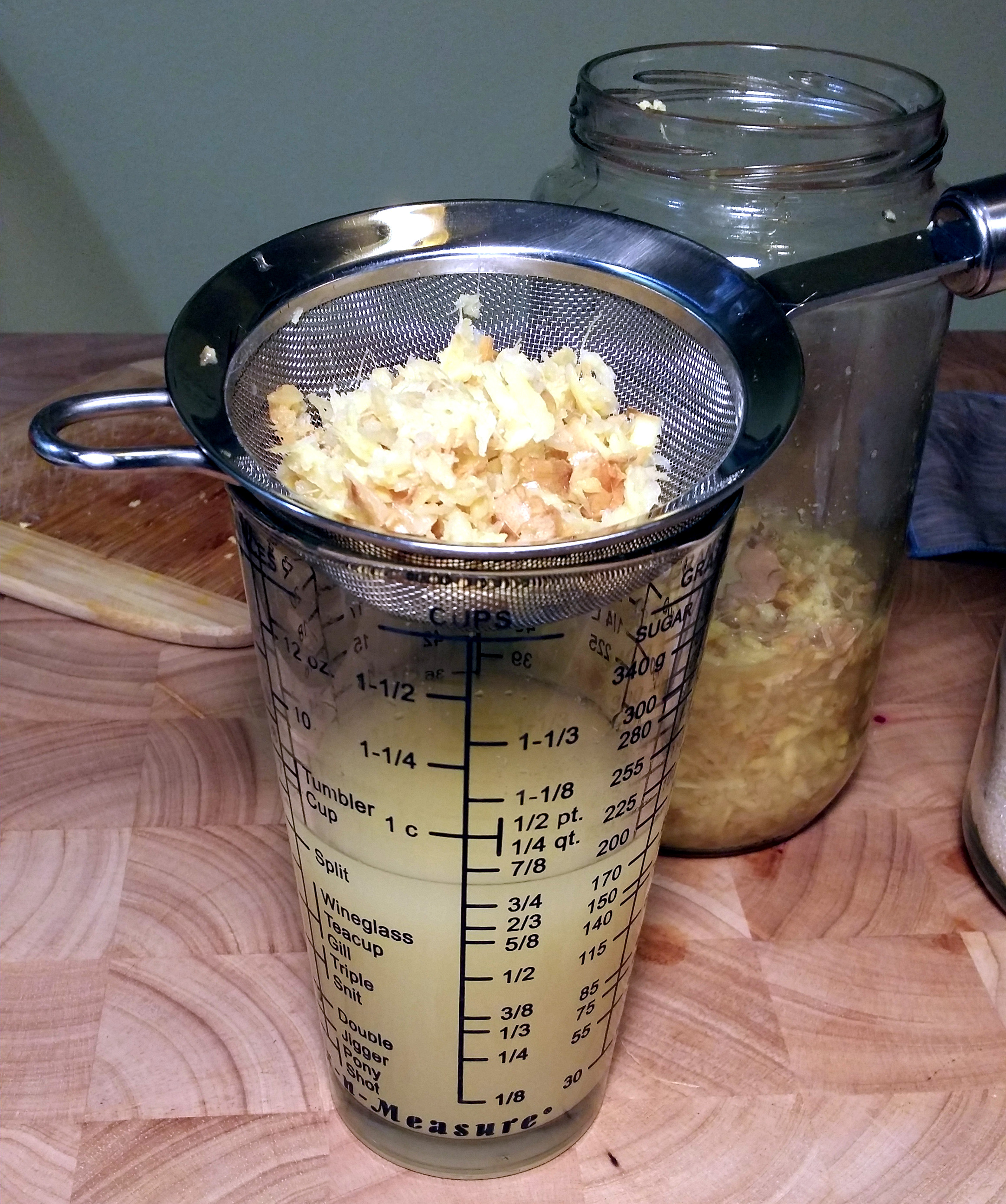 3. While your ginger simmers, stir your ginger bug up. Be sure to incorporate all the white yeasty residue at the bottom of your ginger bug container into the liquid. This is microbe gold. Strain out about 1/2 to 3/4 cup liquid from your ginger bug.
