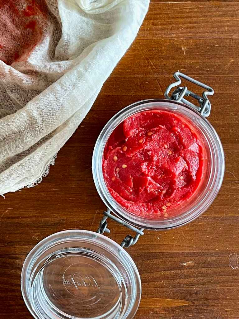 - To strain the tomatoes, place a piece of cheesecloth or butter muslin over a jar. With your fist, push the fabric into the jar to create a suspended pouch that you will fill with the tomato pulp and juice. Secure the cloth to the jar with a rubber band or piece of string. Carefully pour in tomato pulp and juice only to the top of the jar opening. Allow the tomatoes to strain a bit before adding more. Place the lid on the jar and the jar on a plate to catch any drips that the cloth may release. Store on the counter or, if straining for more than a day, in the refrigerator. Strain the tomatoes until the paste reaches the desired consistency.