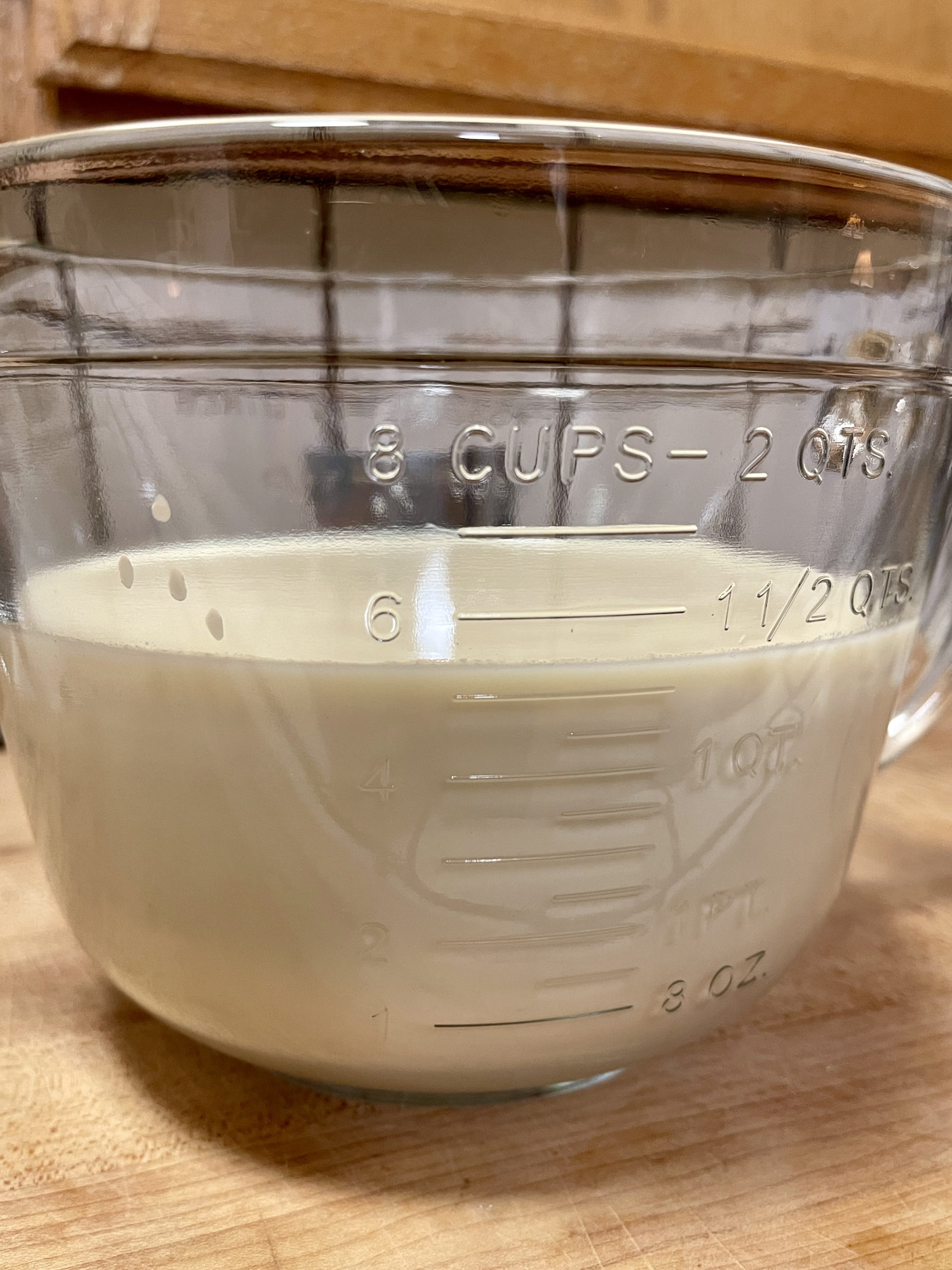 I do make soy buttermilk with homemade soy milk but this vegan buttermilk will work with store-bought soy milk as well. You do not need to make the soy milk to make the the buttermilk. But if you want to make the soy milk, go here for the instructions. I cut that recipe in half. One cup of soybeans yielded over five cups of soy milk plus a generous cup of okara (soybean pulp) that I’ll add to a batch of granola (in the meantime, I stored the okara in the freezer).