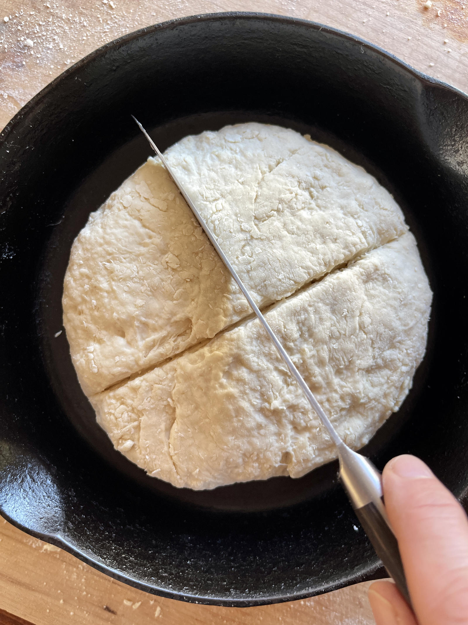 - Place the dough disk on the baking sheet, pie dish or cast-iron skillet. With a sharp knife, score an X across the top, cutting into the dough about ½ inch deep.
