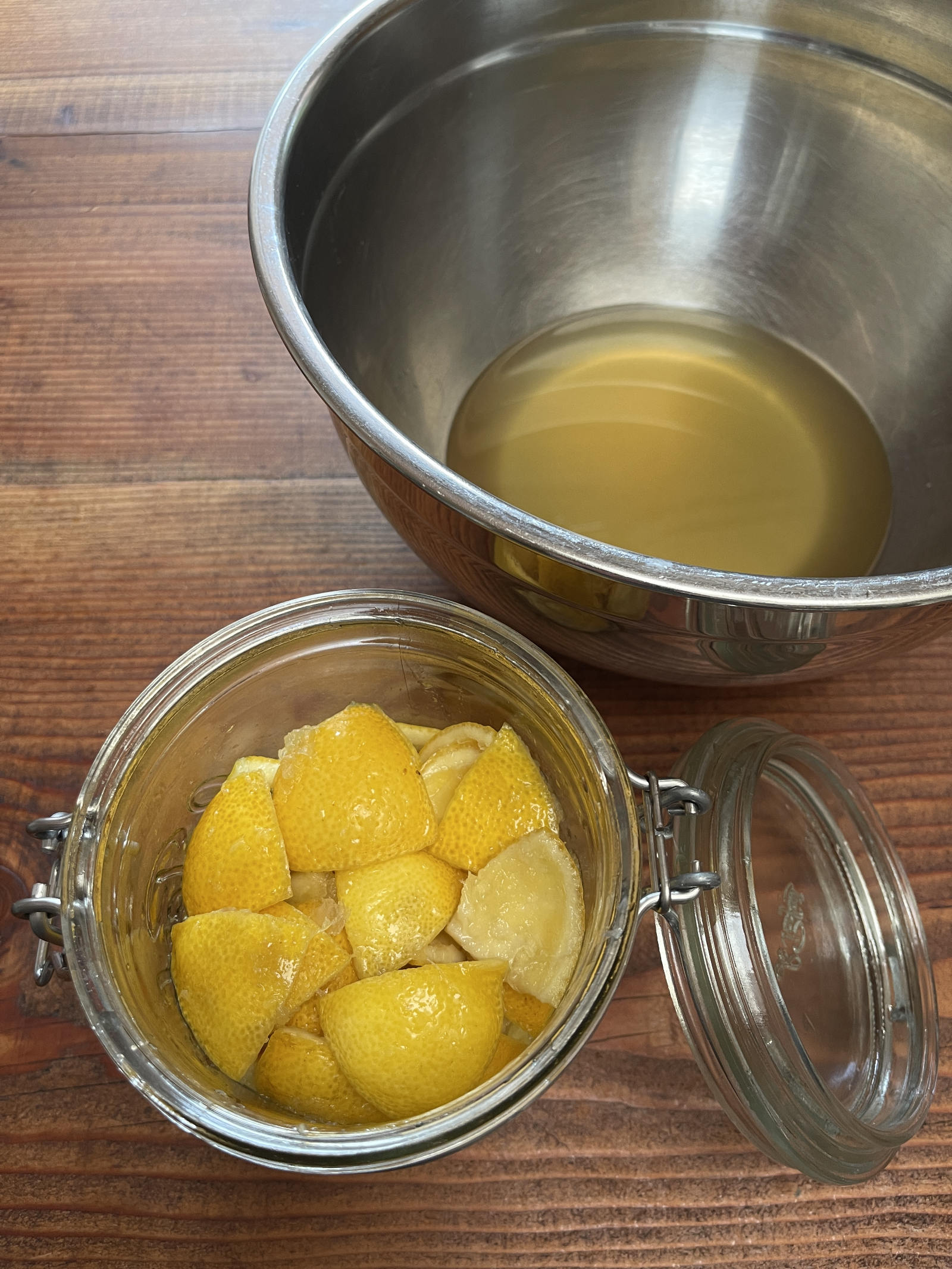 - Cut each juiced lemon half into four pieces. In a non-reactive bowl (stainless steel, glass or ceramic), toss the lemon rinds with the sugar. Cover with a plate or lid and let rest overnight.