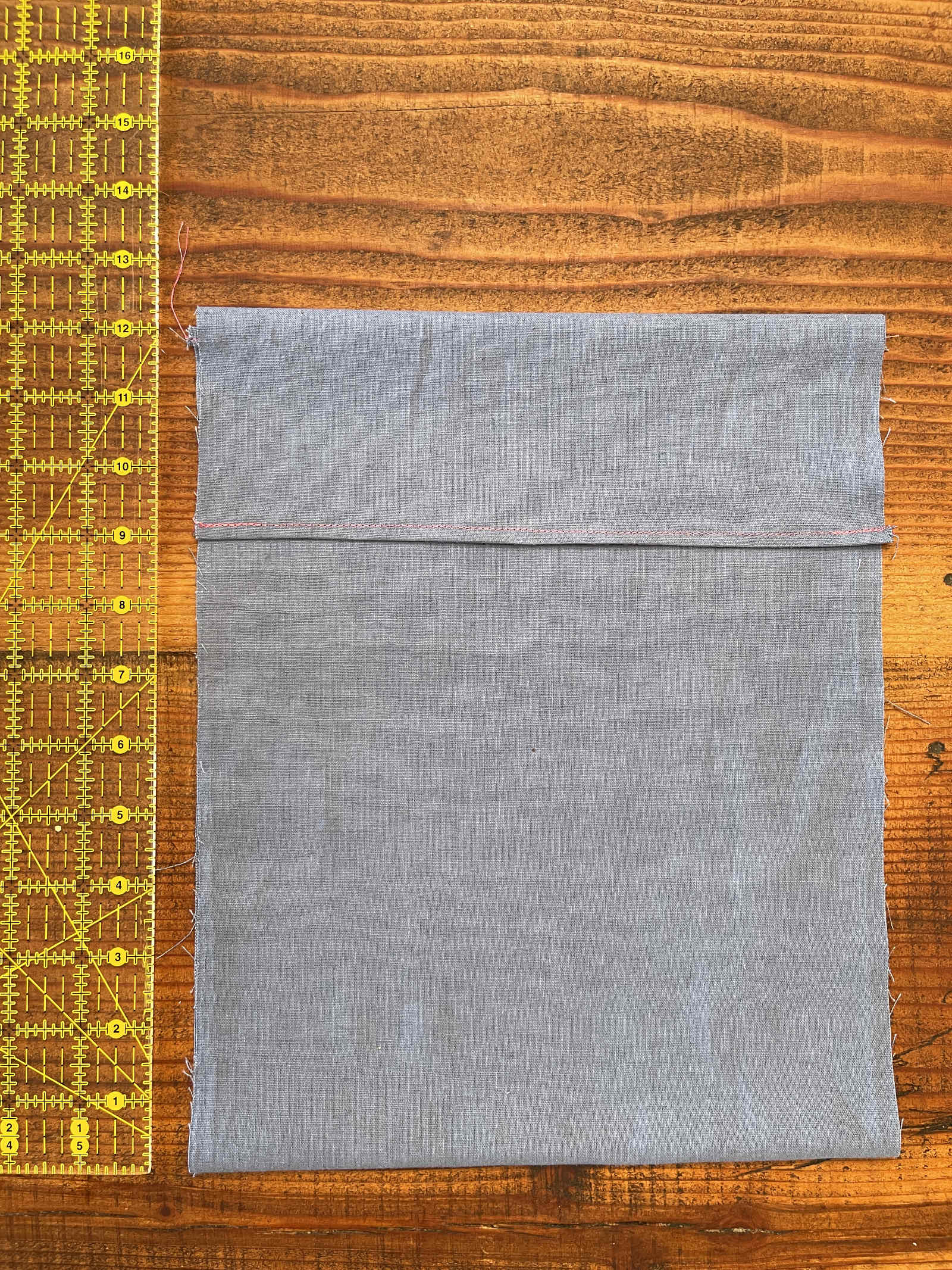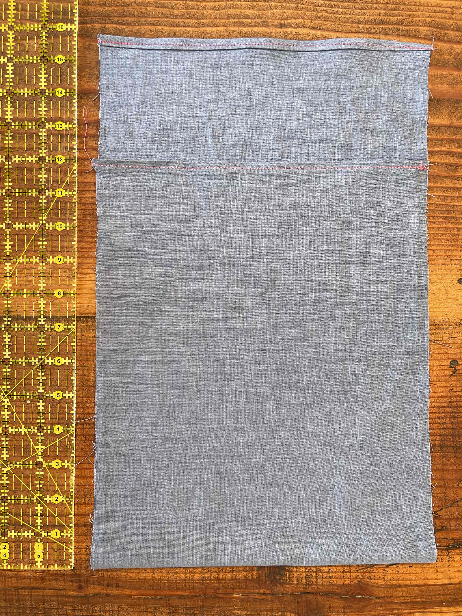 I cut the fabric 29 inches long by 10 inches wide. I made two bags for this post, beginning with identically sized pieces. One bag has a flat bottom, with finished measurements of 11 inches by 8 ยพ inches. The other bag without the flat bottom measures 12 ยผ inches by 8 ยพ inches.