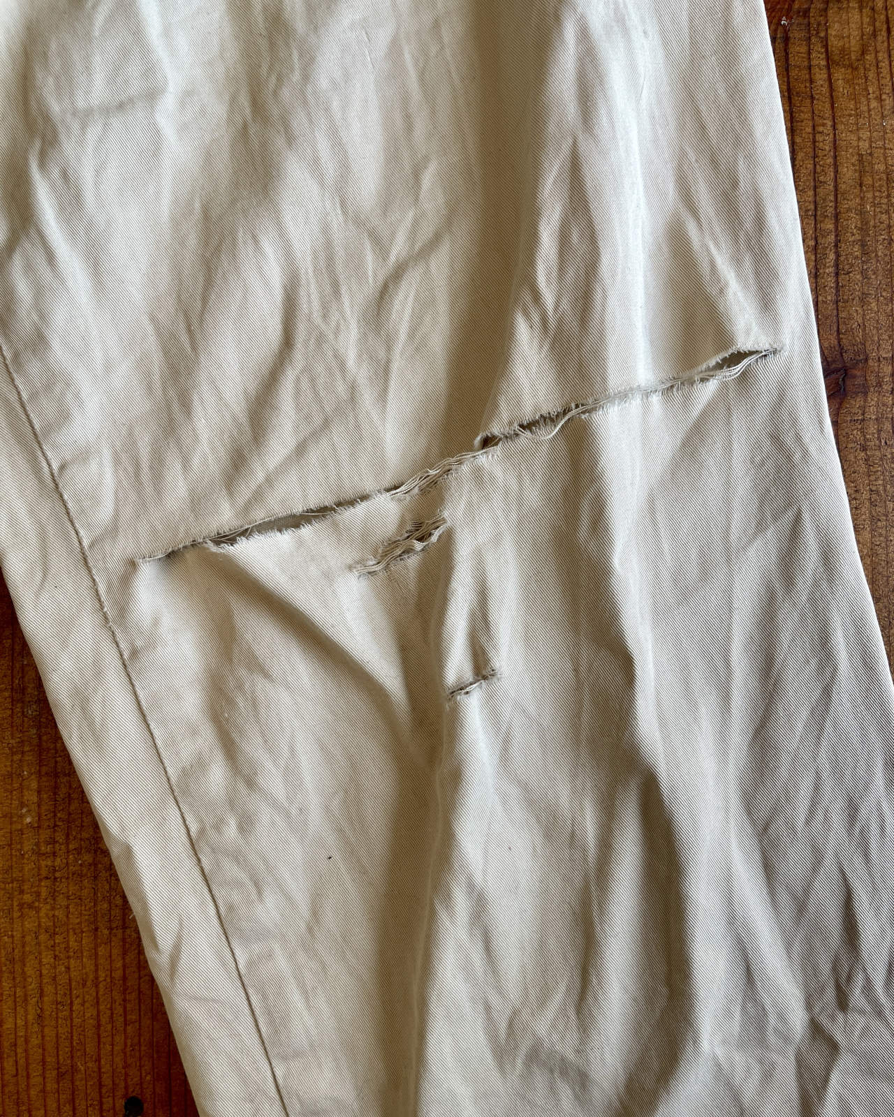 These were hand-me-up work pants my daughter Charlotte didn’t need anymore. I wore them so much that I blew out the left knee. After I patched that up and tested the pants in the gardenโthe patch held perfectly!โthe right leg ripped near the knee.