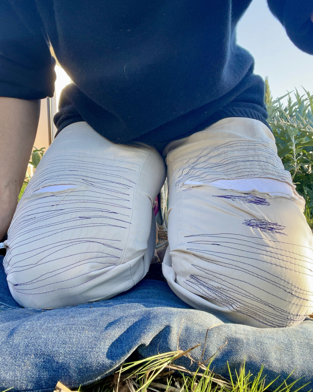 Above, I’m kneeling on a pad I sewed out of worn jeans and stuffed with small fabric scraps. Go here for more info about that.