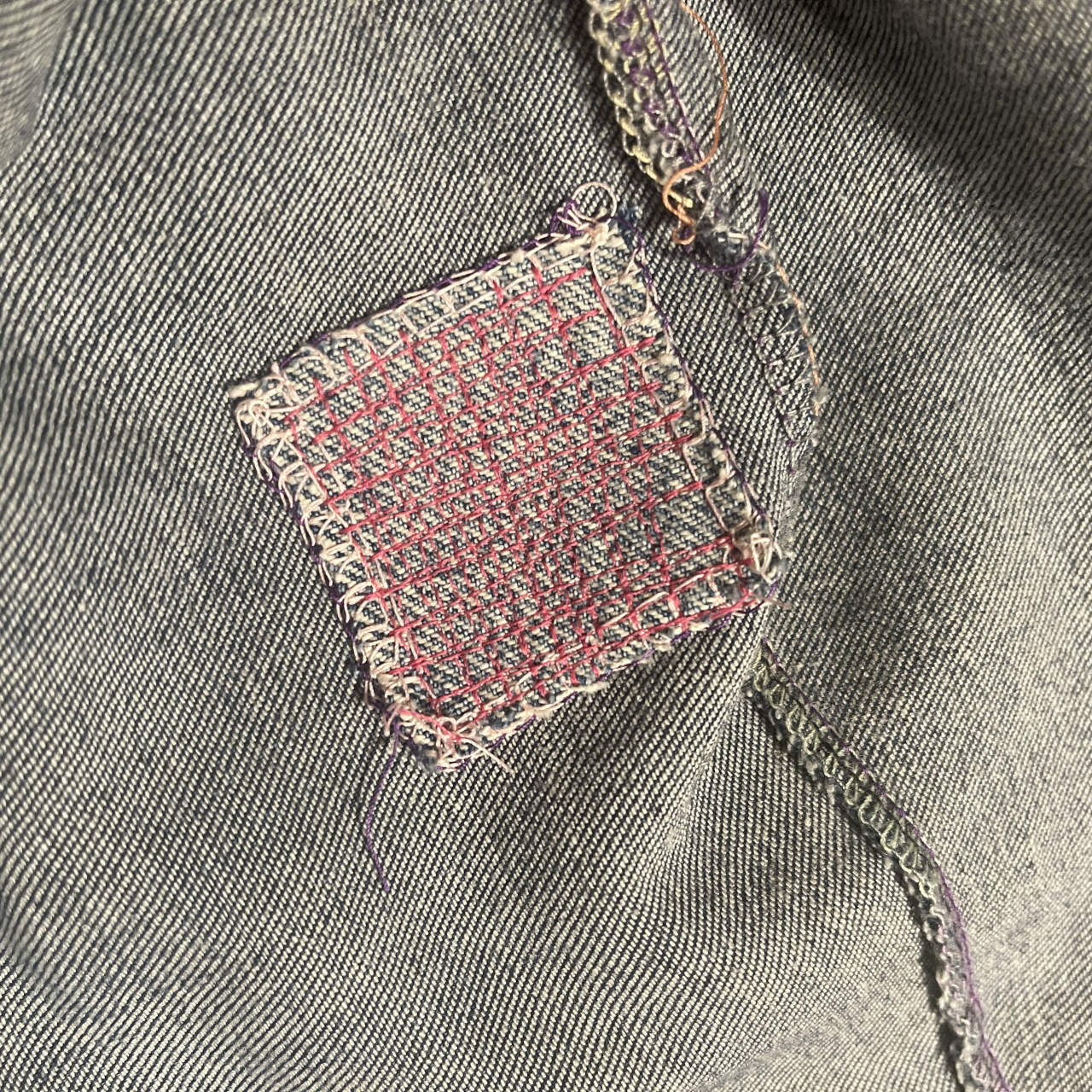The denim bag I made out of worn jeans and take with me everywhere had developed a few small holes. These small holes take only a few minutes to mend.